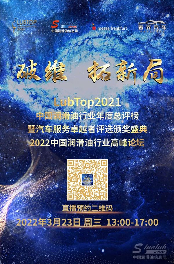 由中国润滑油信息网(www.sinolub.com)、《润滑油市场》杂志发起主办,法兰通联展览(北京)有限公司(AMR中国国际汽保汽配展)联合主办,以“破维,拓新局”为主题的LubTop2021总评榜暨汽车后市场卓越者评选颁奖典礼、2022中国润滑油行业高峰论坛(云发布)定于2022年3月23日(周三)下午通过主办方中国润滑油信息网矩阵全媒体平台全球发布,作为服务于润滑油和汽车后市场产业链的LubTop总评榜,行业领袖、精英翘楚、专家泰斗、上市公司等知名企业CEO、GM、LubTop总评榜获奖企业领导以及多位中外润滑油产业链嘉宾通过云端在线“齐聚一堂”,树立行业标杆,启迪行业未来,以“云”直播的超强传播力与亿万车主和产业链朋友共享王者荣耀!