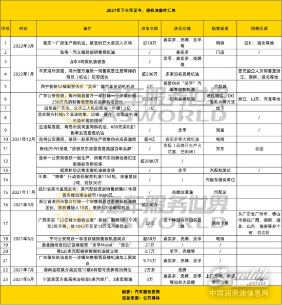 自去年6月份以来,网络渠道所报道的假机油事件,不完全统计也有23起,比2021年全年加起来的数量都多。其中,2021年8月-2022年1月,这半年里所报道的案件就有近20起,涉案金额近30个亿。