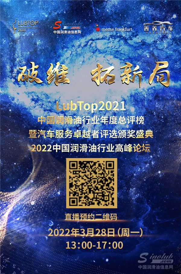 由中国润滑油信息网(www.sinolub.com)、《润滑油市场》杂志发起主办,法兰通联展览(北京)有限公司(AMR中国国际汽保汽配展)联合主办,以“破维,拓新局”为主题的LubTop2021总评榜暨汽车后市场卓越者评选颁奖典礼、2022中国润滑油行业高峰论坛(云发布)定于2022年3月28日(周一)下午通过主办方中国润滑油信息网矩阵全媒体平台全球发布,作为服务于润滑油和汽车后市场产业链的LubTop总评榜,行业领袖、精英翘楚、专家泰斗、上市公司等知名企业CEO、GM、LubTop总评榜获奖企业领导以及多位中外润滑油产业链嘉宾通过云端在线“齐聚一堂”,树立行业标杆,启迪行业未来,以“云”直播的超强传播力与亿万车主和产业链朋友共享王者荣耀!