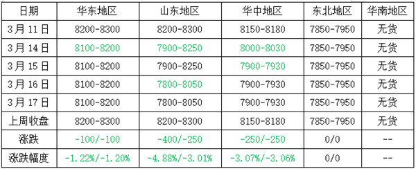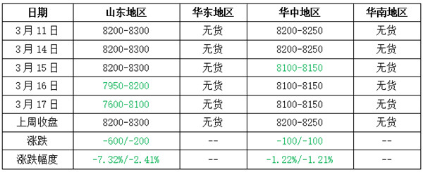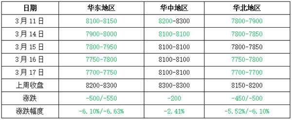 工业白油方面:本周国际原油持续下跌,国内白油市场整体呈现下行趋势。本周国际原油从高位一路下跌,且跌幅较大,两油纷纷跌落100美元/桶下方,国内白油市场避险情绪升温,上游主流厂家价格整体下行为主,下调幅度在50-400元/吨。从供需面来看,本周部分地区上游生产厂家开工负荷有所下降,资源供应量虽有所降低,但库存水平有所上升;而本周下游需求表现一般,商家交投偏谨慎操作,市场成交按需为主。据卓创资讯数据统计,截至3月17日国内5#工业白油主流价格为7600-8100元/吨,5#工业白油全国均价为8000元/吨,较3月10日环比下跌2.32%;10#工业白油主流价格为7800-8200元/吨,10#工业白油全国均价为7900元/吨,较3月17日环比下降3.48%。