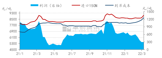 利润方面:本周国内基础油生产厂家理论利润平均为20.17元/吨,环比上周下跌93.55%。国际原油涨后回跌,国内基础油市场价格一路下行,利润空间收窄。本周进口150N利润在-123.15元/吨,环比上周回落140.69%。本周外盘价格继续攀升,而国内售价表现疲软,进口利润明显回落。