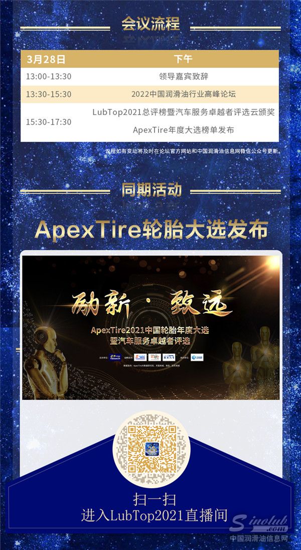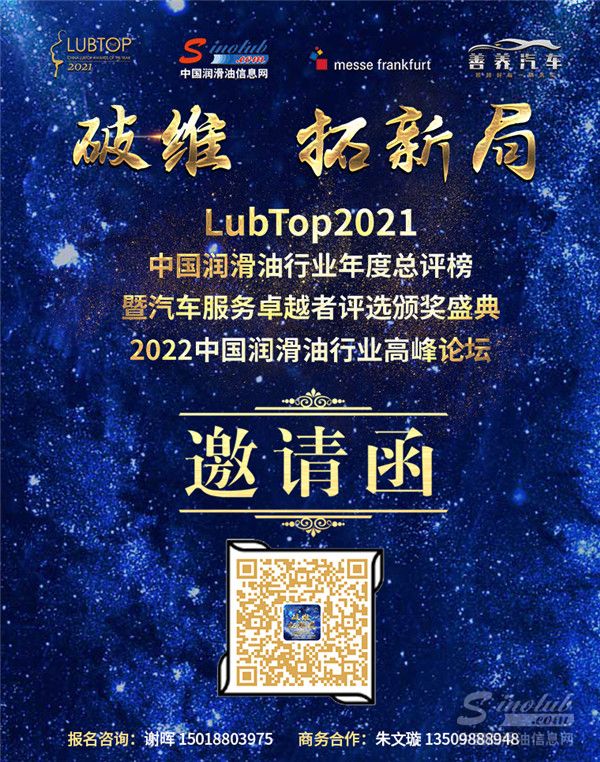 由中国润滑油信息网(www.sinolub.com)、《润滑油市场》杂志发起主办,法兰通联展览(北京)有限公司(AMR中国国际汽保汽配展)联合主办,以“破维,拓新局”为主题的LubTop2021总评榜暨汽车后市场卓越者评选颁奖典礼、2022中国润滑油行业高峰论坛(云发布)定于2022年3月28日(周一)下午通过主办方中国润滑油信息网矩阵全媒体平台全球发布。