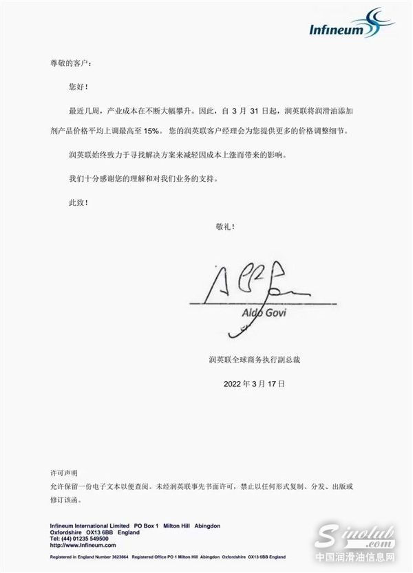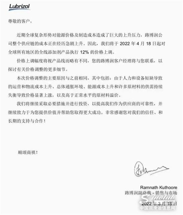 受国际局势影响,昆仑润滑、道达尔能源、润英联、路博润先后发布涨价通知函