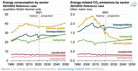 预测到2040年,美国电力部门的排放量将低于工业部门的排放量,工业部门大宗化学品行业所用天然气的增长是工业部门能源消耗增长的主要推动力。到2050年,美国交通运输业的能源相关二氧化碳排放量将会继续高于其他行业;交通运输的碳强度也将高于其他行业,因为届时大多数出行方式将继续使用化石燃料而不是电动汽车。