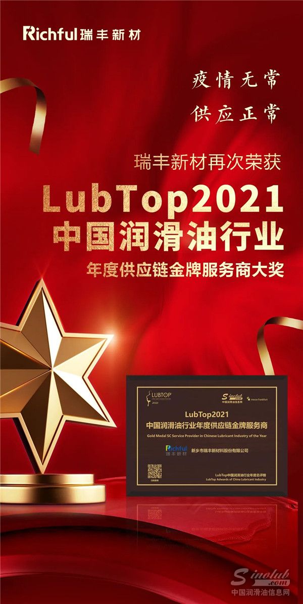 2022年3月28日,LubTop2021中国润滑油行业年度总评榜颁奖盛典在云端盛大发布。瑞丰新材不负众望,再次荣获LubTop2021润滑油行业年度供应链金牌服务商大奖!