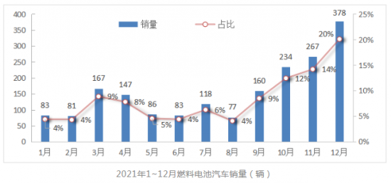 2021年8月,京津冀、上海、广东燃料电池汽车示范应用城市群获得财政部、工信部等五部委批复,城市群燃料电池汽车示范工作开始启动,燃料电池汽车销量9月环比开始持续增长,2021年9~12月燃料电池汽车销量占全年销量的比重达到55%。