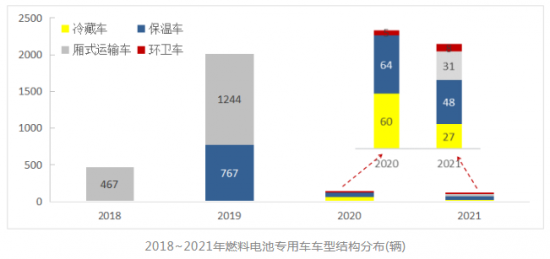 受政策导向作用影响,2021年燃料电池汽车车型结构进一步丰富,半挂牵引车、自卸车等中重型燃料电池汽车销量增幅明显;在专用车方面,2021年燃料电池专用车销量为115辆,同比小幅下滑,但燃料电池专用车车型结构基本保持一致,仍以保温,冷藏及厢式运输车等城市物流场景用车为主。