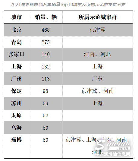 其中,燃料电池汽车示范城市群政策对燃料电池汽车的销售区域产生了较大的影响:2021年在燃料电池汽车销量排名前10的城市中,有多个城市是燃料电池汽车示范城市群区域,如张家口入围河北城市群、保定入围京津冀城市群、苏州入围上海城市群等。此外,山东省“氢进万家”示范工程的实施以及“绿色冬奥”的用车需求,也促进了燃料电池汽车在北京、河北以及山东等省市的推广应用。