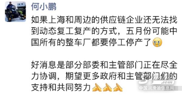 4月14日小鹏汽车创始人、董事长何小鹏在朋友圈发文称,如果上海和周边的供应链企业还无法找到动态复工复产的方式,五月份可能中国所有的整车厂都要停工停产了。不过他也提到了好消息,表示部分部委和主管部门正在尽全力协调,期望更多政府和主管部门们的支持和共同努力。