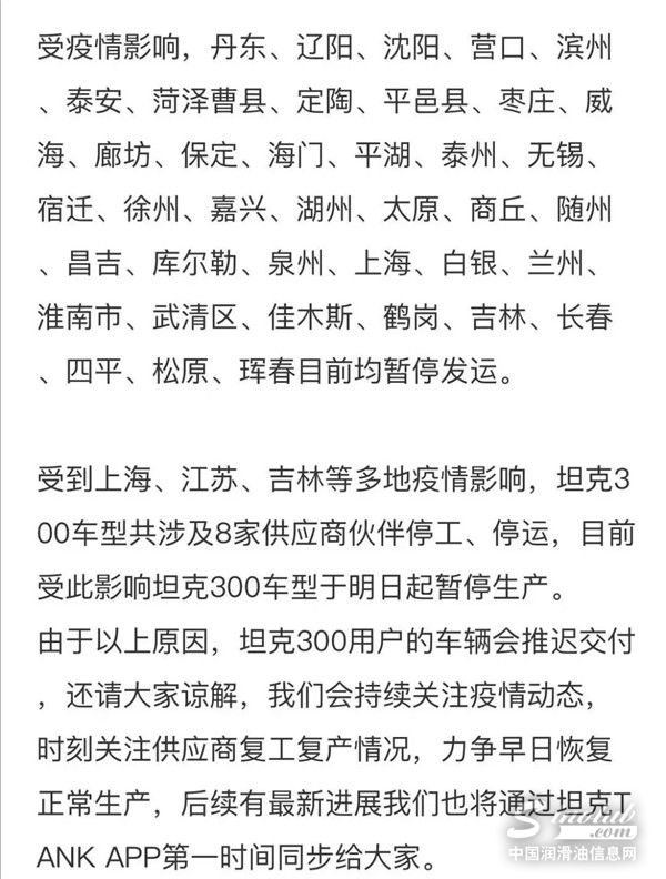 近来受疫情影响多家车企及相关企业遭遇停产。4月13日晚,长城汽车旗下坦克品牌官方发布通知称,受到上海、江苏、吉林等多地疫情影响,坦克300车型共涉及8家供应商伙伴停工、停运,目前受此影响坦克300车型于4月14日起暂停生产。由于以上原因,坦克300用户的车辆会推迟交付。