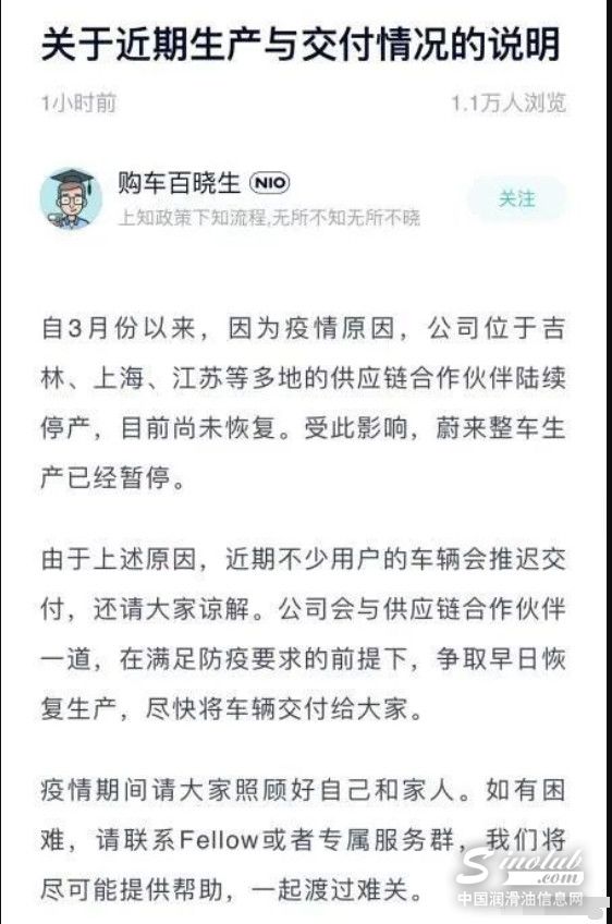 4月9日,蔚来汽车在其官方APP上表示,自3月份以来,因为疫情原因,公司位于吉林、上海、江苏等多地的供应链合作伙伴陆续停产,目前尚未恢复。受此影响,蔚来整车生产已经暂停。由于上述原因,近期不少用户的车辆会推迟交付,还请大家谅解。公司会与供应链合作伙伴一道,在满足防疫要求的前提下,争取早日恢复生产,尽快将车辆交付给大家。(突发!蔚来停产!)