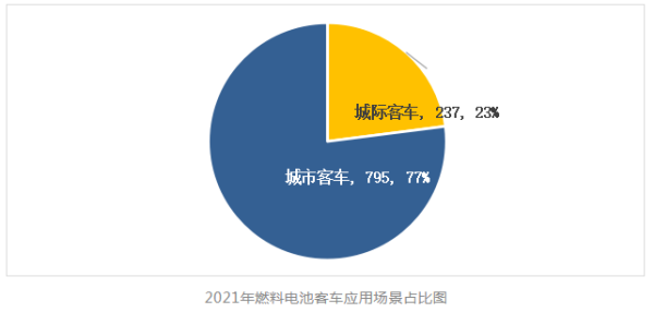 从应用场景来看,公交领域依然是燃料电池客车最主要的应用领域。2021年燃料电池城市客车销量达到795 辆,占比77%;城际客车237 辆,占比23%。