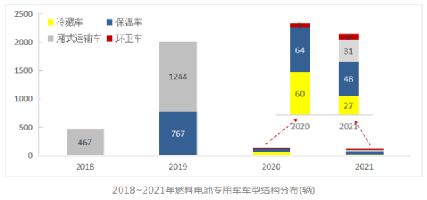 在专用车方面,2021年燃料电池专用车销量为115辆,同比小幅下滑,但燃料电池专用车车型结构基本保持一致,仍以保温,冷藏及厢式运输车等城市物流场景用车为主。