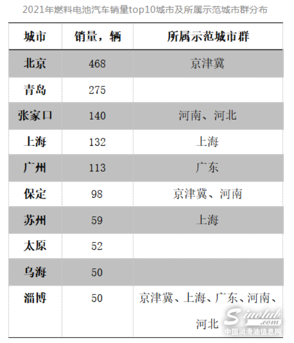 其中,燃料电池汽车示范城市群政策对燃料电池汽车的销售区域产生了较大的影响:2021年在燃料电池汽车销量排名前10的城市中,有多个城市是燃料电池汽车示范城市群区域,如张家口入围河北城市群、保定入围京津冀城市群、苏州入围上海城市群等。此外,山东省“氢进万家”示范工程的实施以及“绿色冬奥”的用车需求,也促进了燃料电池汽车在北京、河北以及山东等省市的推广应用。