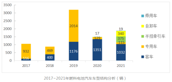 从车型结构来看,2021年燃料电池客车销量达到1032辆,尽管同比下降23.6%,但燃料电池客车依然是燃料电池汽车最主要的车型。