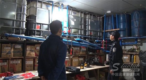 开门后,民警发现该厂房内有机油分装设备,以及大量的散装机油和多种品牌机油桶,初步判断此处疑似为一生产假冒伪劣机油窝点。