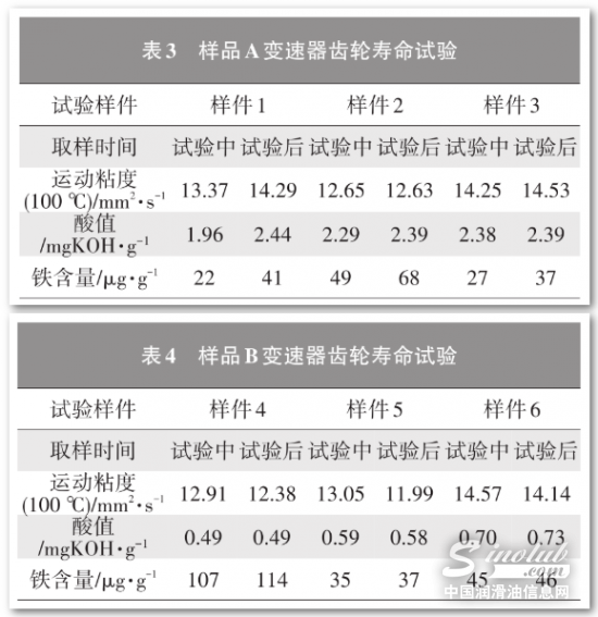 选取同一批次变速器 6台试验样件,样件 1~样件 3进行样品 A变速器齿轮寿命试验,样件 4~样件 6 进行样品 B 变速器齿轮寿命试验。在试验中期850 h抽检样品,试验后1 700 h抽检样品。样品 A 检测结果见表 3,样品 B 检测结果见表 4。从试验结果可知,样品 A、样品 B 在变速器齿轮寿命试验中100 ℃运动粘度、酸值变化值和铁含量变化均在换油判定标准技术指标内。样品A、样品B均表现出了良好的变速器齿轮保护性能。