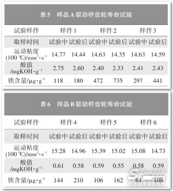 选取同一批次驱动桥 6台试验样件,样件 1~样件 3进行样品 A驱动桥齿轮寿命试验,样件 4~样件 6 进行样品 B 驱动桥齿轮寿命试验。在试验中期850 h抽检样品,试验后1 700 h抽检样品。样品 A 检测结果见表 5,样品 B 检测结果见表 6。从试验结果可知,样品 A、样品 B 在驱动桥齿轮寿命试验中100 ℃运动粘度、酸值变化值和铁含量变化均在换油判定标准技术指标内。样品A、样品B均表现出了良好的驱动桥齿轮保护性能。