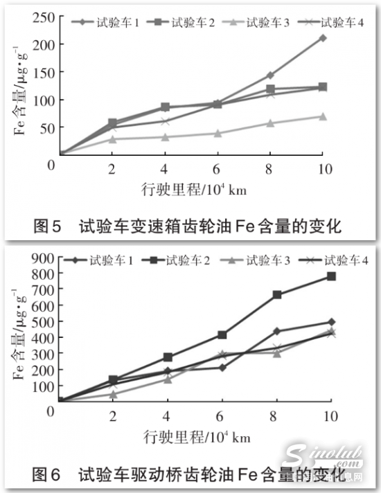 从图5、图6分析可知,10×104 km目标里程时,试验车变速器齿轮油中的Fe含量均<0.25×10-3 ,驱动桥中齿轮油的Fe含量<0.9×10-3 ,所有齿轮油Fe含量均<1.5×10-3 的换油限值。驱动桥齿轮油中Fe含量均高于变速器齿轮油中Fe含量,原因是驱动桥中齿轮面压力更大从而使得金属面磨损更严重。