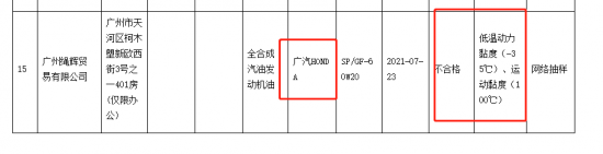 这款机油在抽查中有两项不合格,分别为低温动力黏度(-35℃)、运动黏度(100℃)。