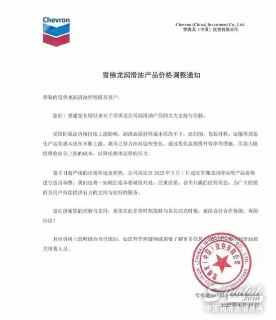 雪佛龙也在近期提出了对中国市场润滑油产品涨价的计划。具体原因依然是国际原油价格上涨。涨价的日期定在了5月1日,具体涨价细节说明另行通知。