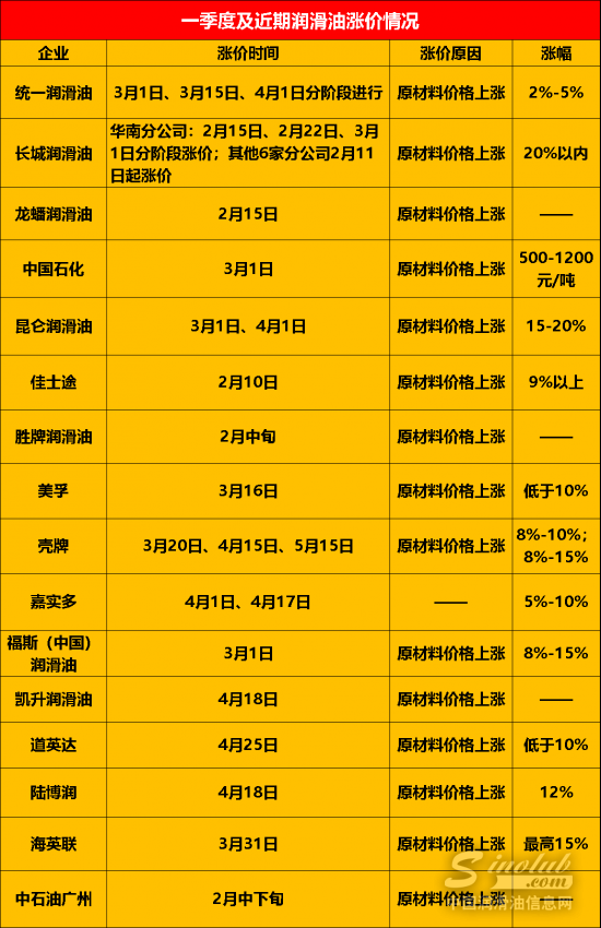 而在刚刚过去的一季度中,不少润滑油企业选择了涨价,其中不乏大幅度提升产品价格的企业,而原因基本是原材料价格上涨。