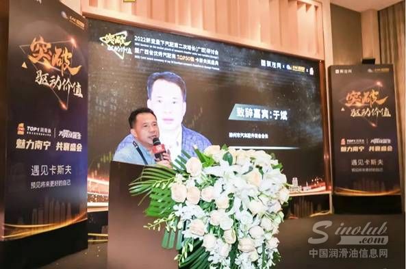 柳州市汽车配件商会会长于斌为颁奖盛典致辞,在致辞中首先肯定了下午的主题研讨会的意义和价值,通过下午的学习交流,看到了许多优秀的汽配商行业同仁,大家都在探讨如何去做增量,如何做选择,怎么去经营好我们的事业;同时对卡斯夫奖的举办非常肯定,经过2020-2021两年的卡斯夫中国行活动,已把全国各地的优秀汽配行业人都组织起来了,大家相互了解学习,相互促进和共享资源,今天活动能够真正带动广西汽车后市场的发展,把汽配行业做得更加红火,不畏困难,勇往直前。