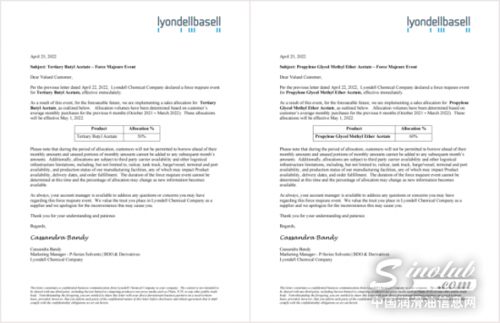 值得注意的是,4月以来,化工巨头利安德巴赛尔因机械故障等不可抗力因素,也多次发布公告,醋酸原料、醋酸叔丁酯、乙二醇乙醚醋酸酯(EBA,DBA)等产品供应出现短缺。4月15日,位于德克萨斯州拉波特(La Porte)的醋酸原料一氧化碳供应系统发生了机械故障。4月22日,宣布醋酸叔丁酯、乙二醇乙醚醋酸酯(EBA,DBA)等产品遭受不可抗力影响。4月25日,发布配额销售通知:公司正在实施醋酸叔丁酯、丙二醇甲醚醋酸酯等产品的销售分配。