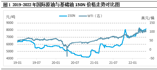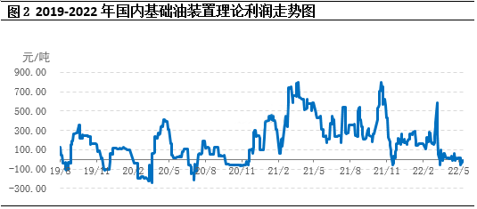 从图1中可以看到,基础油与原油的价格走势基本一致,基础油价格上行或下行的时间节点略有延迟,这也符合原料与下游之间的价格传导规律。2022年4月份至今,国际原油高位盘整,国内基础油生产企业成本居高不下,利润呈现倒挂局面。