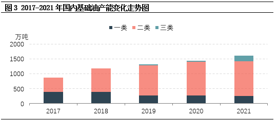截至2021年年底,国内基础油产能共1600万吨/年,其中基础油一类产能250万吨,占比15.63%;基础油二类及三类产能共1315万吨/年,占比82.19;煤制油装置35万吨,占比2.19%。