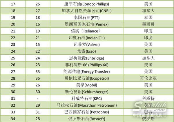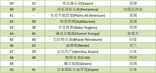 榜单排名前十依次是:壳牌、沙特阿美、中国石油、中国石化、bp、道达尔、雪佛龙、马来西亚国家石油公司、阿布扎比国家石油公司及埃克森美孚。