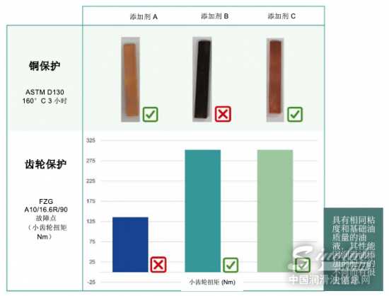优化润滑油可以对整个系统的性能产生深远的影响。示例数据(如图)显示了配方的改变如何在不影响其他部件保护的情况下增强齿轮保护。