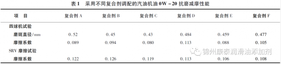 在相同的基础油和黏指剂前提下,我们选择了6种复合添加剂分别调配了汽油机油0W-20,其中复合剂A、复合剂B和复合剂C均满足API SP/GF-6A规范;复合剂D、复合剂E和复合剂F均满足ACEA C5规范。对这6款油品进行了抗磨减摩性能测试,以初步筛选出具有较好减摩性能的复合添加剂,测试结果见表1。