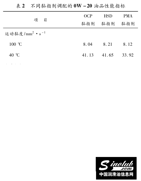 黏指剂主要对发动机油的黏度指数、高温高剪切黏度、低温动力黏度等指标有影响。目前用于发动机油中的黏指剂主要有OCP、HSD和PMA三大类。本文分别采用这三种不同类型的黏指剂,并采用相同的基础油和复合剂C调配了汽油机油0W-20,对其相关指标进行了测评,测试结果见表2。