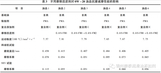 (1) 在开发节能型汽油机油0W-20配方时,要综合考虑基础油种类、复合添加剂、黏指剂及摩擦改进剂等的有效复配,才能达到较好的抗磨减摩性能和节能表现。