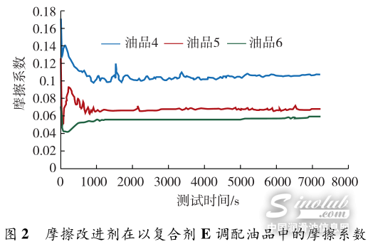 目前常用的摩擦改进剂主要有油溶性有机钼盐和无灰型有机减摩剂两大类。其中,油溶性有机钼盐目前应用最为广泛,其具有优秀的改善摩擦系数和抗磨作用,在较高温度下可以显著降低摩擦部件之间的摩擦系数,从而达到节能的目的。而无灰摩擦改进剂大多通过物理吸附在摩擦表面形成易于剪切的吸附膜来达到降低摩擦的目的,主要在低温工况下发挥作用,且在使用过程中消耗较少,因而具有较强的降低摩擦的保持能力。因此,在低黏度发动机油中将两种类型的摩擦改进剂复配使用可获得更好和更持久的燃油经济性表现。