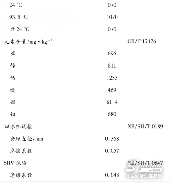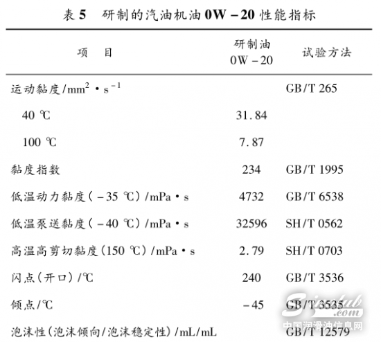根据以上的研究结果,最终我们确定了以Ⅲ类基础油、PMA型黏指剂和符合API SP/GF-6A规范的复合剂C,并加入0.6%减摩剂FM1和0.6%减摩剂FM2调配成了汽油机油0W-20,对产品性能进行了全面评价,结果见表5。