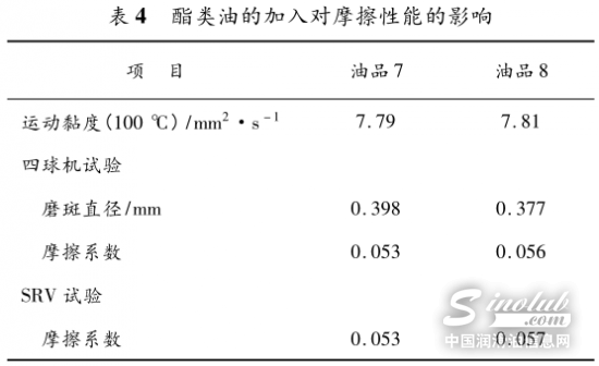 在低黏度发动机油中,基础油主要选用Ⅲ类油、PAO或者酯类基础油,而目前大多以Ⅲ类油为主。考虑到酯类油的极性和良好的润滑性能特点,我们研究了在油品2和油品5的方案中,采用适量的酯类油替代部分Ⅲ类油分别得到了油品7和油品8,并对其抗磨减摩性能进行了测试,结果见表4。