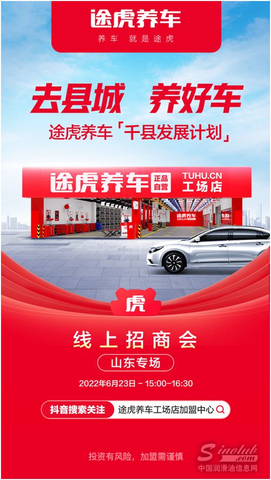 秉持“去县城,养好车”的初心,途虎养车“千县发展计划”的首站最终选择了山东。6月23日,首站山东专场招商会将采用线上直播形式,于15:00准时与大家相约在“途虎养车工场店加盟中心”抖音直播间。