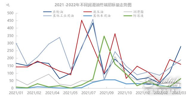 据数据显示,2022年各类润滑油的招标量在1月份开始都出现了大幅下跌,各产品跌幅在25-45%左右。1-5月数据总和显示,液压油同比下降18%,齿轮油同比下降25%,其他工业油同比下降45%,润滑脂同比下降45%,防冻液同步增加162%。
