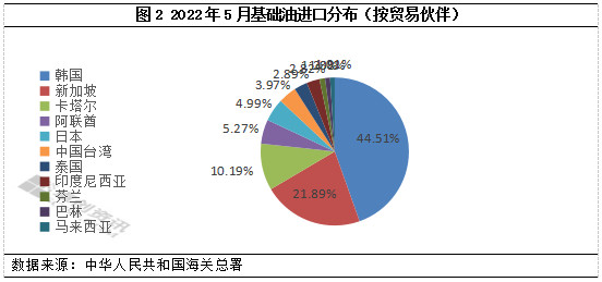 从贸易伙伴来看,韩国、新加坡、卡塔尔依旧为5月进口量前三位,排名维持稳定,其中自韩国进口基础油在6.16万吨,占5月进口总量的44.51%;自新加坡进口的基础油在3.03万吨,占5月进口总量的21.89%;自卡塔尔进口基础油达1.41万吨,占5月进口总量的10.19%。