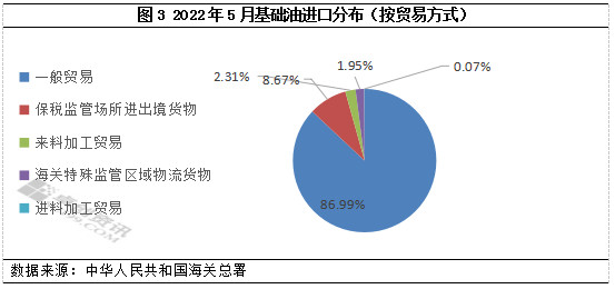 从贸易方式来看,5月,国内基础油进口贸易方式中一般贸易居首,保税监管场所进出境货物及来料加工贸易分别排名二、三位。据海关数据显示,5月份一般贸易模式进口基础油数量在12.04万吨,占当期进口量的86.99%;保税监管场所进出境货物1.20万吨,占当前进口量的8.67%;来料加工贸易0.32万吨,占当期进口量的2.31%。