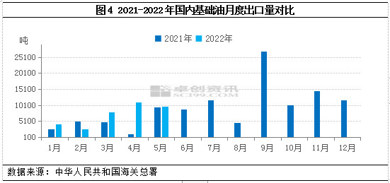 从出口情况来看,受国际基础油价格攀升影响,国产基础油性价比优势提升,自3月份起,出口呈现增长趋势,并于4月份达到年内高值,5月份受国内资源供应收紧影响,出口数据有所回落,但整体仍高于一季度均值。据海关数据显示,5月份国内基础油出口量为0.98万吨,环比下跌11.11%,同比上涨3.58%。2022年累计出口基础油3.56万吨,同比上涨53.47%。