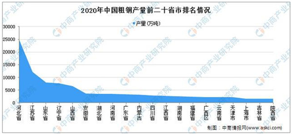 从粗钢产量区域占比来看,2020年华北地区粗钢产量最高,占比35.0%,其次为华东地区,粗钢产量占比30.4%,东北地区、华中地区产量占比分别为9.6%、9.2%。