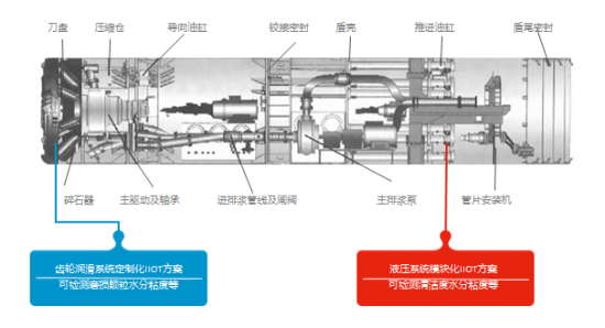 由齿轮润滑系统定制化IIOT方案和液压系统模块化IIOT方案两部分组成,分别针对盾构机中的重点工作部位——齿轮与液压系统,进行定制化维保。
