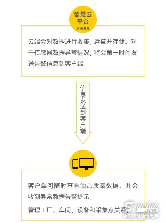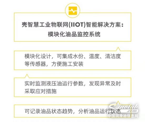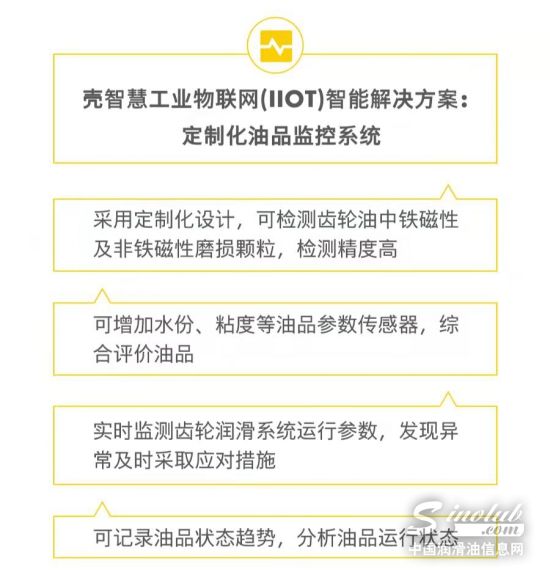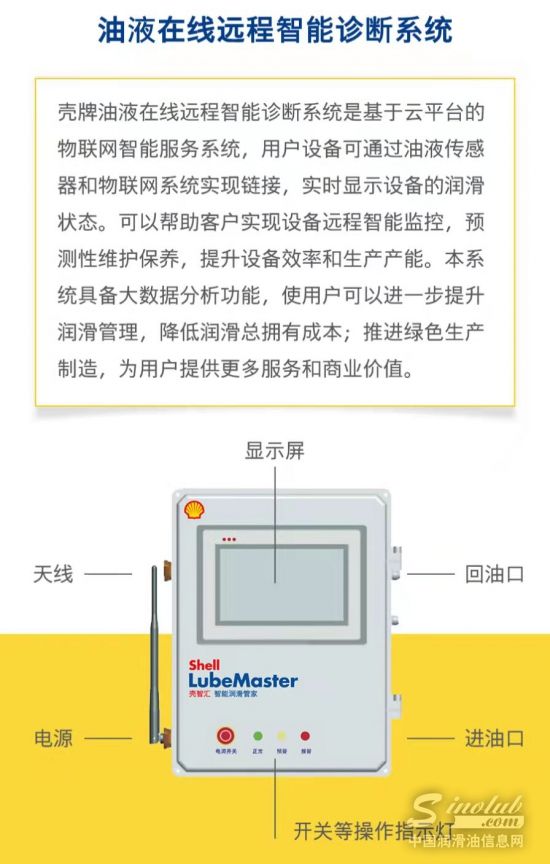 2018年,随着工业互联网技术的成熟,壳牌不断投入研发,推出“壳智汇 IOT 物联网智能解决方案”,采用传感器技术和互联网技术,实现润滑在线实时监控。高精度的传感器,可以监控包括粘度,微量水分,含水率,清洁度,磨损颗粒,介电常数在内的多种参数。通过壳智汇云平台的先进算法及数学模型,把传感器原始的数据转化成对客户最有用的现场数据,并在手机端和电脑端进行实时展示。