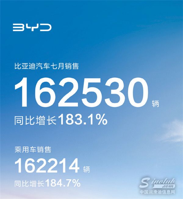 7月份通常对于汽车行业而言是淡季,不过从整体的市场情况来看,7月份的销量依然保持较高的增长速度。日前比亚迪也发布了7月份的销量数据,7月份比亚迪共售出汽车162530辆,同比增长183.1%,其中乘用车销售162214,同比增长184.7%,环比增长21.3%,至此,比亚迪已经连续5个月销量突破10万大关,截止至7月份比亚迪今年销量已经超80万辆,这个成绩可谓是前所未有的亮眼。