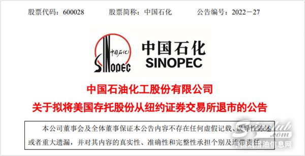 中国石油化工股份有限公司(“公司”)已于 2022 年 8 月 12 日(美国东部 时间,下同)通知纽约证券交易所(“纽交所”),公司将根据一九三四年美国 证券交易法(经修订)(“证券交易法”)规定,申请自愿将其美国存托股份(“存 托股”)从纽交所退市。经综合考虑一些相关因素,包括公司发行在外的存托股 所对应的 H 股数量与公司全部 H 股数量相比较少,公司存托股的交易量与公司 H 股全球交易量相比相对有限,以及长期维持存托股在纽交所上市和该等存托股 及对应 H 股在美国证券交易委员会(“美国证交会”)注册并遵守证券交易法规 定的定期报告及相关义务所涉的较大行政负担,公司董事会批准存托股从纽交所 退市,并根据未来相关实际情况,在公司满足证券交易法相关规定的前提下申请 撤销该等存托股和对应 H 股的注册。