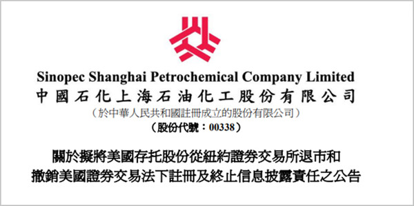 中国石化上海石油化工股份有限公司(「本公司」或「公司」)根据证券及期货条例第 XIVA 部以及香港联合交易所证券上市规则(「上市规则」)第 13.09(2)(a)及 13.10B 条的披露义务作此公告。公司已于二零二二年八月十二日(美国东部时间)通知纽约证券交易所(「纽交所」)公司拟根据一九三四年美国证券交易法(经修订)(「证券交易法」)自愿将代表公司 H 股(「H 股」)的美国存托股份(「存托股」)从纽交所退市(「退市」),并在法律条件成熟后撤销注册及终止其对美国证券交易委员会的报告义务。退市决定乃根据若干考量因素做出,包括公司发行在外的存托股所对应的 H 股数量与公司全部H股数量相比较少,公司存托股的交易量与公司H股全球交易量相比相对有限,以及维持美国存托股在纽交所上市和该等存托股及对应H股在美国证券交易委员会(「美国证交会」)注册并遵守证券交易法规定的定期报告及其他相关义务所涉的较大行政负担和成本。公司董事会批准存托股退市,并根据未来相关实际情况,在公司满足证券交易法相关法律规定的前提下申请撤销该等存托股和对应 H 股的注册。公司拟于二零二二年八月二十六日或前后向美国证交会提交退市申请表格 25,将其存托股从纽交所退市。该等退市预计在 25 表格提交后十日生效。