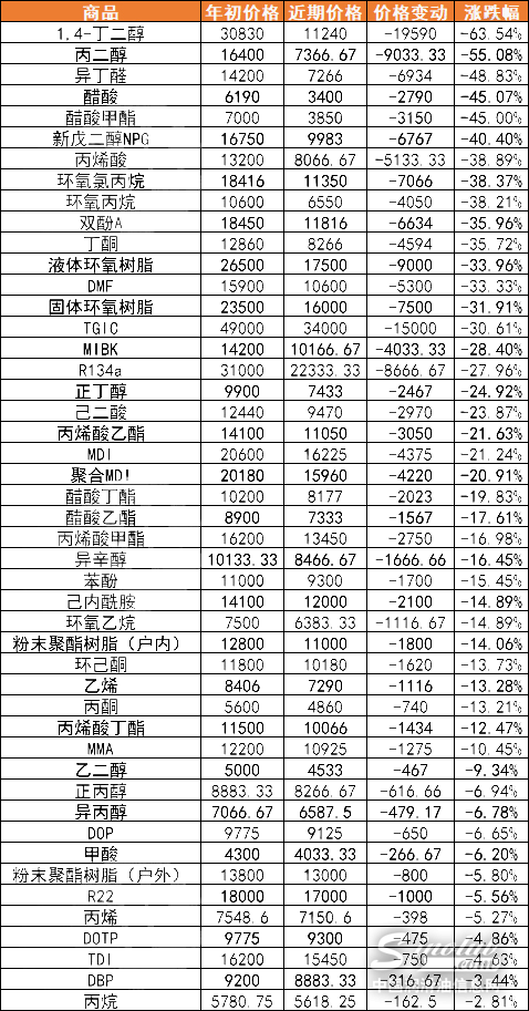 据不完全统计,近期80多种石油产业链及衍生产业链产品受此影响价格下跌明显,不仅跌幅惊人,且较年初价格基本吐出所有涨幅,甚至比开年时的价格还要低。石油产业链上受到直接影响而价格下跌的化工品超过40余种,其中丁二醇、TGIC吨价下跌均超过万元,丁二醇、丙二醇的跌幅超过50%,堪称腰斩。